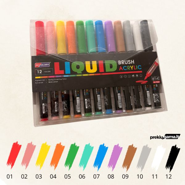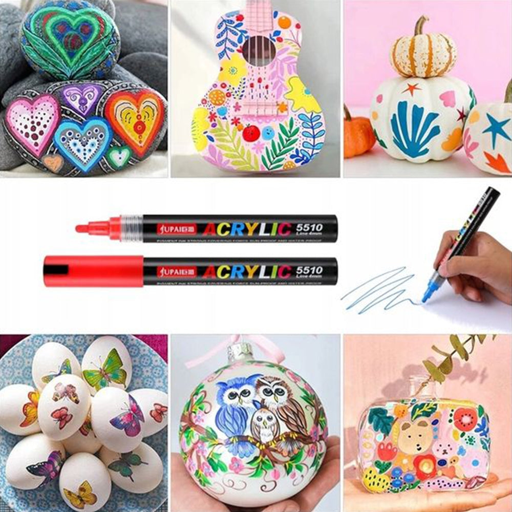 Šie akriliniai markeriai leis kurti ryškiai ir ant beveik bet kokio paviršiaus – nuo popieriaus ir kartono iki akmens, tekstilės, plastiko, stiklo, keramikos ar net medžio. Jie neblunka, netepa ir padengia paviršių tolygiai.