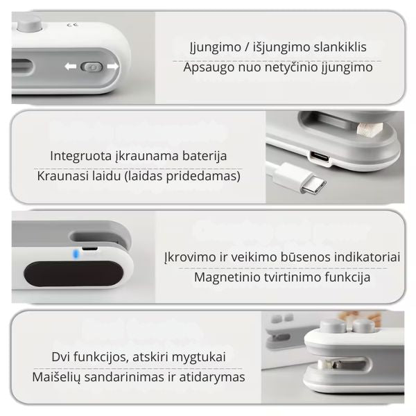 - Rinkinį sudaro: 1 × belaidis maišelių sandariklis, 1 × USB-C įkrovimo laidas, Originali pakuotė
