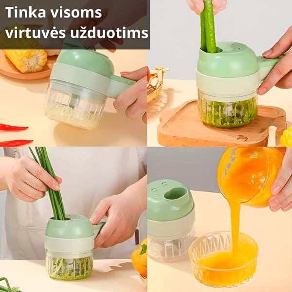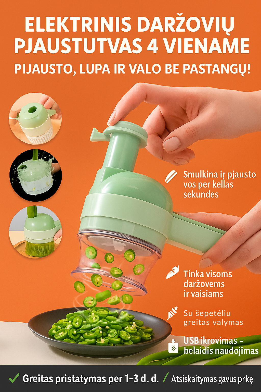 Šis naujos kartos elektrinis pjaustytuvas sujungia 4 funkcijas viename – pjausto, smulkina, lupa ir net valo. Vos kelios sekundės, ir daržovės paruoštos gaminimui – be nuovargio, be netvarkos ir be rankų darbo. Puikus pagalbininkas visiems, kurie nori gaminti greitai ir švariai.