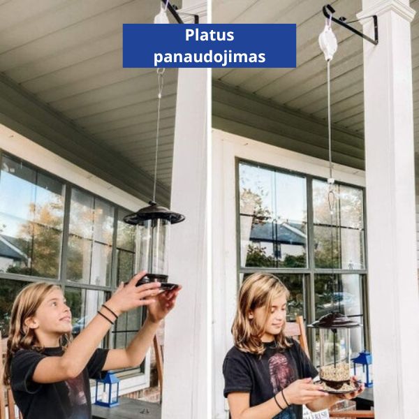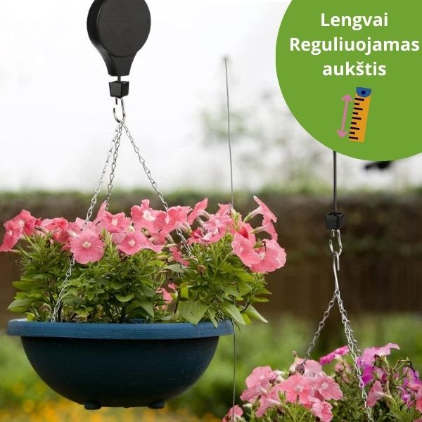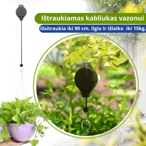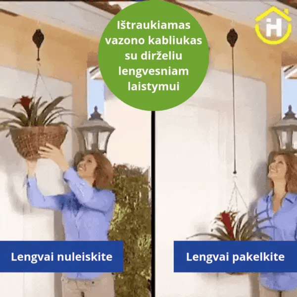 Šiuo kabliuku labai paprasta ir lengva naudotis, tiesiog patraukite vazoną žemyn iki norimo aukščio ir palaistykite, po to staigesniu judesiu patempkite dar šiek tiek žemyn ir pakabintas vazonas pakils.