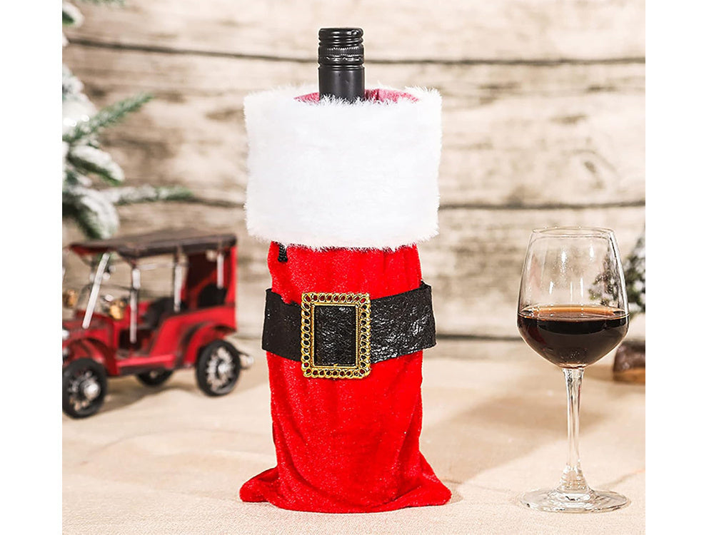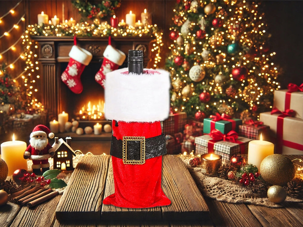 Kalėdinis butelio užvalkalas „Kalėdų Senelio kostiumas“ – stilinga šventinė stalo puošmena ir dovanos akcentas