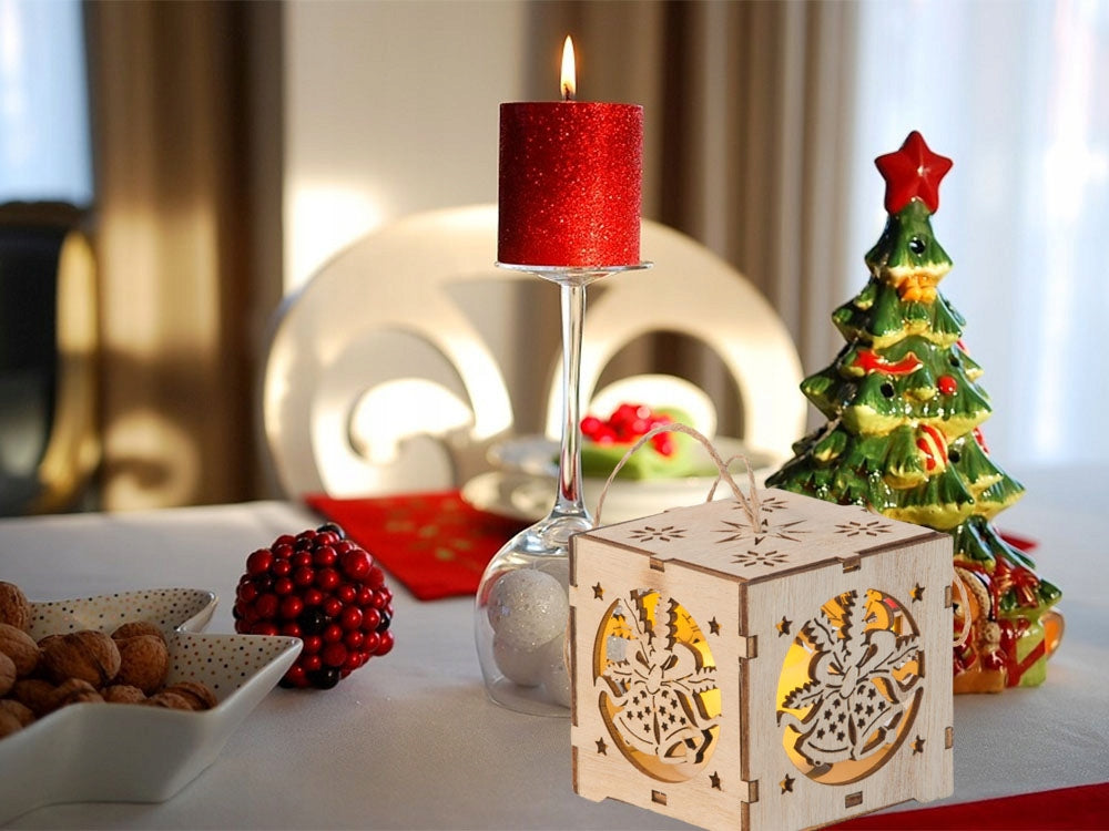 Šis medinis žibintas išsiskiria natūralumu – išpjauti varpeliai ir žvaigždutės leidžia šviesai sklisti švelniai, be akinimo, sukuriant ramią ir šiltą aplinką.
