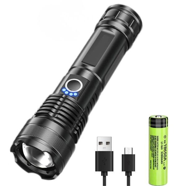 Pilnai įkrautas žibintuvėlis veikia iki 4–5 valandų, o įkrovos indikatorius rodo likusį energijos kiekį (4 mėlynos LED lemputės).