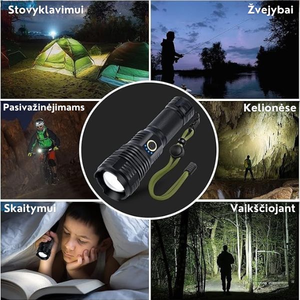 - Režimai: 100 %, 60 %, 30 %, SOS, stroboskopas