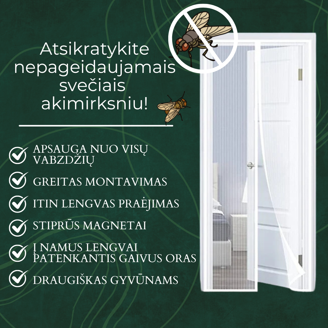 Magnetinis durų tinklelis yra puiki priemonė apsisaugoti nuo įvairių vabzdžių. Šios dvigubos durų užuolaidos prasiveria Jums ar Jūsų augintiniui praėjus ir užsidaro akimirksniu. Tai efektyviai apsaugo nuo vabzdžių patekimo į namus. Tinklas yra padalintas į dvi dalis, kurios turi po magnetą, todėl yra puikiai pritaikytas naudoti balkono, terasos ar pagrindinėms namų durims. Itin galingą trauką turintys magnetai pritraukia abi tinklelio puses ir jas sujungia nepalikdamas tarpų.