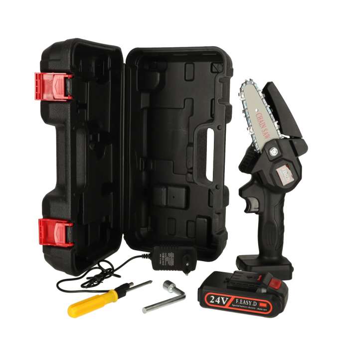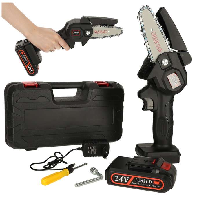 Belaidis rankinis pjūklas (rinkinyje yra dėžė, pjūklas, grandinė, baterija, pakrovėjas)