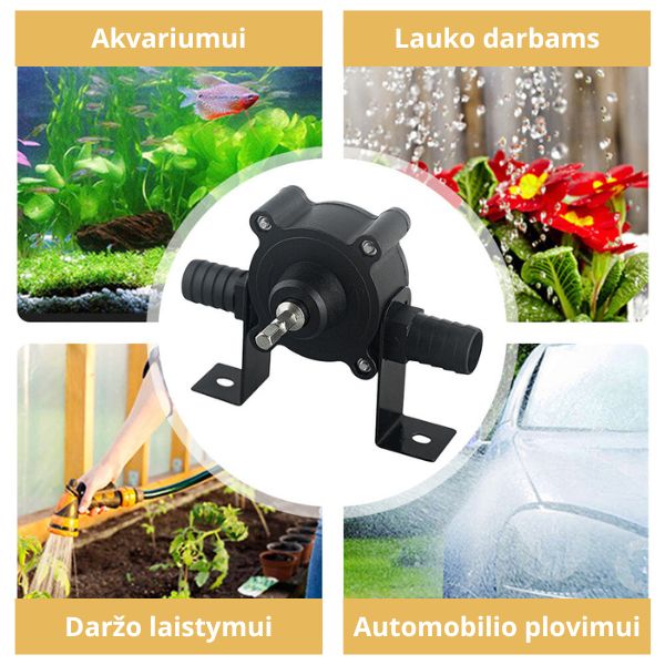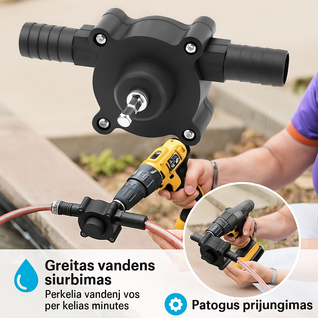 Vandens pompa tvirtinama prie gręžtuvo – greitas ir patogus vandens siurbimas be elektros